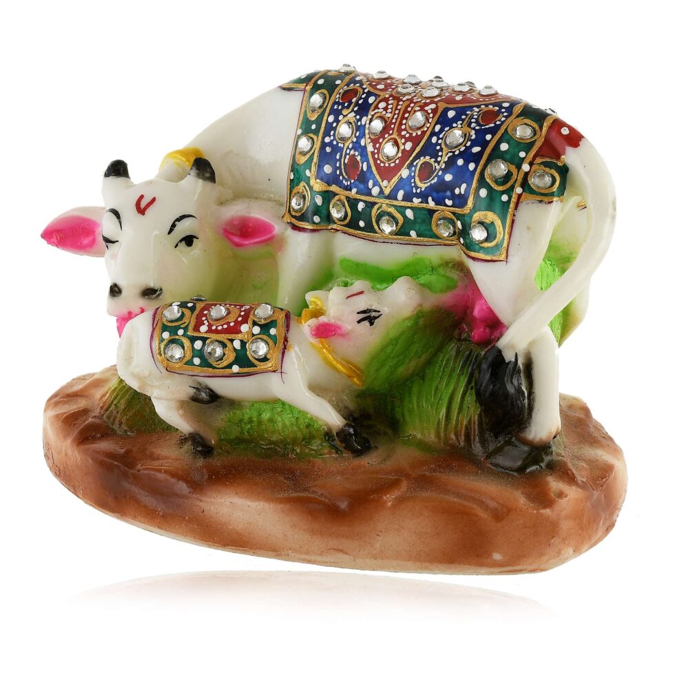 White Marble Kamdhenu Cow and Calf Statue (8.5 cm x 12 cm)
